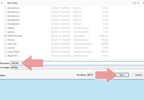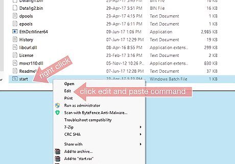 Copy the commands from the pool into your mining start file. Go to the home page of the pool you want to join to find instructions on how to mine in that pool. The instructions may be directly on the home page, on a Help page, or on an FAQ page. The instructions consist of text code you will configure to create a batch file to start mining. Copy the code from the pool's website. Then, from your desktop, open your Claymore miner folder. Right-click the text file named "Start" and click "Edit." Paste the code into that file.