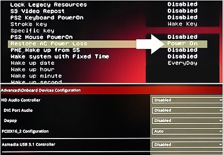 Configure your mining rig's BIOS settings. Turn your rig on and press the "delete" key several times until the BIOS configuration screen comes up. Then you'll need to change a few options so that your rig runs at maximum efficiency. If you plan on running your rig 24/7, change the power options so that it automatically comes on when it has power. That way in the event of a power outage, your rig will come back online when power is restored. This is also handy if you haven't installed a power button. Disable components you won't use to save a little power. Typically you can disable onboard audio and most of the peripheral ports. Set the PCIe speed to Gen1 to ensure your OS recognizes all of your GPUs.Tip: You may have to come back and tweak this later if you have GPUs that aren't showing up in your OS.