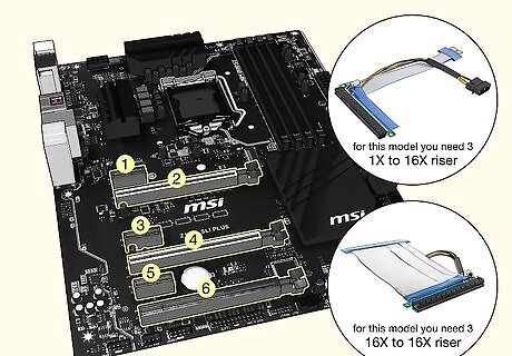 Choose a motherboard with at least 6 PCIe slots. If you're using 6 GPUs, you need a motherboard with enough slots to connect them all. Along with the motherboard, get 6 risers so that you can connect your GPUs to the motherboard without attaching them directly onto the board. Risers also allow you to connect your GPUs directly to your power supply, to reduce the power drain on your motherboard. Expect to spend between $100 and $200 USD for your motherboard. You can get a 6-pack of risers for under $50 USD.Tip: Your rig doesn't come with a power button, so you'll have to jump the power switch pins on your motherboard each time you turn it on. If you plan on turning it off and on frequently, you can buy a power button for less than $5 USD.