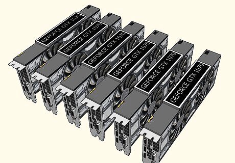 Invest in at least 6 video cards (GPUs). The video cards are the most important part of your mining rig since they actually do the work of solving the equations in the blockchain to mine the cryptocurrency. Most mining rigs include at least 6 video cards. This will typically be the most expensive part of your mining rig. The more powerful your video cards are, the faster they'll solve equations – this is referred to as their hash rate. However, the most powerful video cards may run more than $1,000 USD a piece, an expense that will definitely cut into whatever profit you might earn.