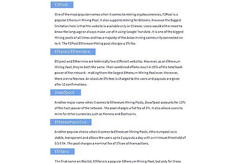 Choose a mining pool near you to join. Check out several mining pools and compare the fees charged, frequency of payout, and location. Generally, you want to choose a mining pool that has a server in your general geographic area. For example, if you live in the United States, you wouldn't want to join a mining pool in China. The further away from the server you are, the greater the lag time between your rig and the server. If there's a significant lag, your rig may be working on blocks that have already been solved. Research the reputation of mining pools before you choose one to join. Avoid pools that have only been in existence for a year or less.Tip: Nanopool and Etheremine are 2 popular mining pools that are both established and reputable. F2Pool is based in China and used by a majority of the Asian mining community.