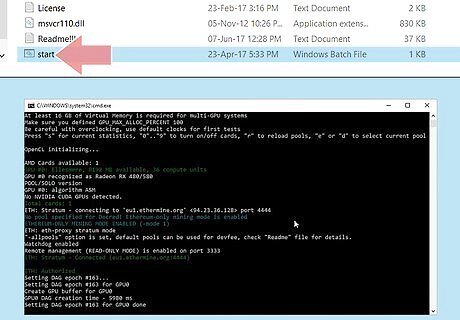 Double-click your batch file to start mining. Your batch file connects you to the pool and begins your mining operation. Double-click your shortcut when you're ready to start. the miner will initialize your GPUs and start hashing away at the blockchain. Give your miner about 20 seconds to get going, then click "s." This will display your hash rate. You can plug your hash rate and other information into a profitability calculator, such as https://etherscan.io/ether-mining-calculator, to determine how much Ethereum your rig will mine.