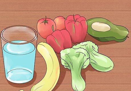 Eat a healthy, hydrating meal. Eating a meal rich in whole grains, vegetables, and lean protein before you leave will help to get your trip off on the right track. Foods with lots of water in them are also good components, as hydration has been shown to help keep the body and brain awake. You can also pack some healthy snacks such as carrots, fruit, and nuts to take with you. These will provide natural doses of energy, and the act of chewing and the sensations on your tastebuds will also help combat drowsiness and tedium. Though salty and sweet snacks such as chips and candy can be tempting, try to avoid them. The sugar high and salty satisfaction they offer are short-lived and can lead to an energy crash.