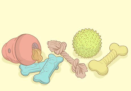 Encourage good chewing by providing your dog with toys and treats. If you provide your dog with acceptable things to chew on, they will have fewer incentives to chew inappropriate objects. Make sure that your dog has a supply of toys and treats available to them wherever they go. That way, whenever they has the urge to chew, you can offer them something appropriate, or they can find something on their own. Good choices include: Rawhide treats Chewing strips Teething rings Ropes Squeaky toys Raw bones (but no raw bones that can be a choking hazard, such as chicken bones) Kong toys (which can be filled with food)