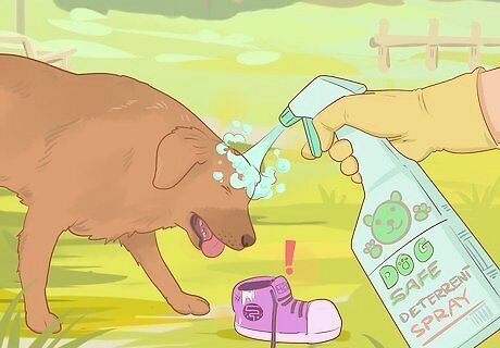 Use deterrent sprays. Dogs are much less likely to chew on things with tastes that they find unpleasant. Thus, you can discourage your dog from chewing on certain things by rubbing or spraying them with bad-tasting substances. Deterrent sprays in unpleasant flavors like bitter apple are available from pet supply stores. In addition, you can spray a weak solution of a common unpleasant-tasting substance (white vinegar, hot sauce, cayenne pepper, lemon juice, etc.) mixed with water. Always use a non-toxic substance. Never try to deter your dog from chewing with a substance that can cause harm or illness. This technique works best if your dog has a habit of chewing a particular object, or something immobile. For instance, you can spray chair legs with a bitter apple flavor if your dog has a habit of chewing on them. This method is not fool-proof; some dogs will chew even if the item tastes bad.