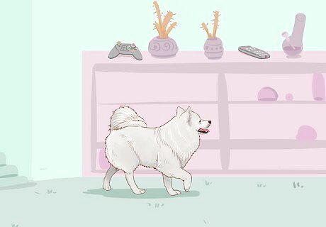 Keep objects you don’t want your dog chewing out of their reach. Prevention can be the easiest way to stop your dog from chewing inappropriately, so remove any temptations. Place objects your dog likes to chew (or might chew) out of their reach: in a cabinet, high off the floor, in a bag or box, etc. Objects such as remote controls, shoes, and books are common temptations for dogs that like to chew. Poisonous plants, electrical cords, cleaners, and any other hazardous objects should also be kept out of your dog’s reach.