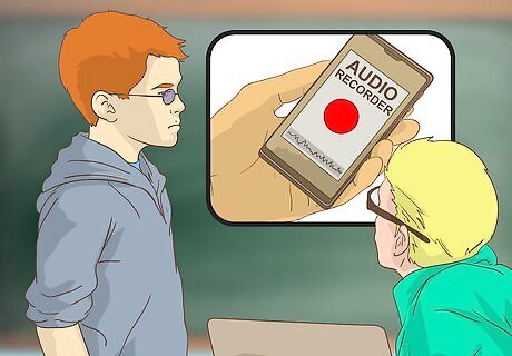 Tell your teacher if you’re using an audio recorder. If you record lectures, talk to your teacher about how they can accommodate you. Test your device with them before class starts to make sure you get a clear recording. Be sure to ask your teacher to verbalize anything they write on chalkboards or other visual aids they use. You can also help your teacher remember that moving around too much or talking with their back to you might muffle the recording.