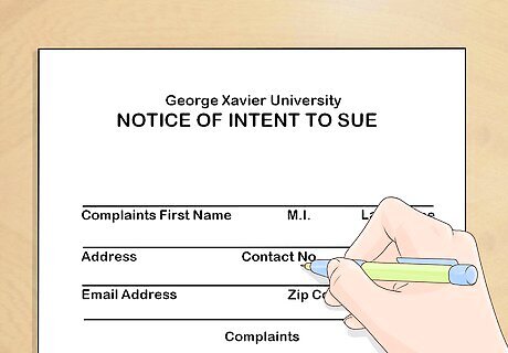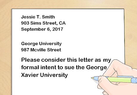 Draft a notice letter, if a form isn’t available. If you can't find a form to use, you may have to draft a letter yourself. This should be a formal letter that details your cause of action and states that you intend to sue the school for that reason. Typically, you also must cite the law or policy that you believe the school has violated. If you can't find a form, it may be in your best interest to get an attorney to draft the letter for you.