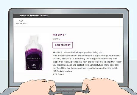 Purchase Reserve through the Jeunesse website or another online retailer. One of the quickest and easiest ways to order this product is through the internet. You can simply go to the company's main website and follow the link at the top of the page to "products." However, you can also order it through a few other online retailers, such as Amazon. Once on the products page of the Jeunesse website, you can select Reserve and add the product to your cart. Once it is in your cart, follow the directions for check out, including paying for the product and giving your shipping address.