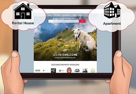 Consider a variety of accommodations. When on vacation, hotels are not your only choice for accommodations. Consider a rental house, apartment, or other options that might be pet friendly. You could also try to stay with a friend or family member who loves your pet, and you. For instance, camping on the beach would work well with certain pets. This is a good way to keep your pet close and you can find a campground, a beach cabin, or an RV site along many coastlines. Vacation rental homes can be a great option for vacations with your pet, especially if the home is owned by an individual who also has pets. If the owner is used to pets being in the home, then they may be more willing to let you bring yours there as well.