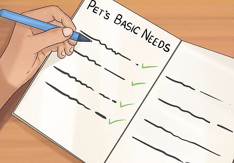 Make sure your pet's basic needs are met while on vacation. Make a list of everything that your pet needs on a daily basis. This should include, at minimum, food and water, but may include things like medications, sunscreen, a leash or travel container, and a surface to sleep on. Just make sure that the pet will have its basic needs met. Depending on where you are going, you may need to bring all of your pet's supplies with you. For instance, if you will be staying at a beach that is far from stores, you will need to bring pet food for the whole trip with you.