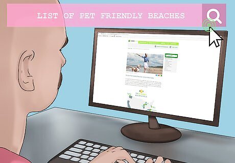 Make sure you choose a beach that allows pets. Use the internet to determine whether a beach is pet friendly. You can look at a beach's website, lists of pet-friendly beaches, or the parks and recreation department of the city where you will be traveling. They will tell you about any restrictions on pets at the local beaches, such as seasonal restrictions where dogs are only allowed on the beach during the off season. There are some beaches, particularly private ones, that won't let you have your pet on them. For example, California has some the most pet-friendly beaches in America, but there are still likely some beaches there that don't allow pets.