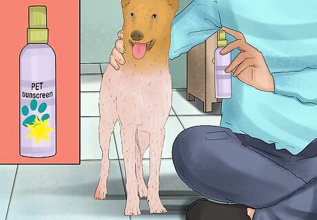 Protect your pet from the sun. If you plan on spending a lot of time on the beach, remember to protect your pet's skin, in addition to your own. Pets can get sunburned if they are in the sun too long, so apply sunscreen if necessary or protect your pet by keeping it in the shade or putting protective clothing on it. If you are putting sunscreen on your pet, be sure that it is appropriate for your type of pet. For example, dogs should have a dog-friendly sunscreen applied, which is available at most pet supply stores.