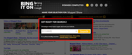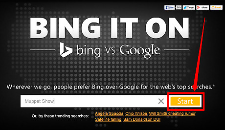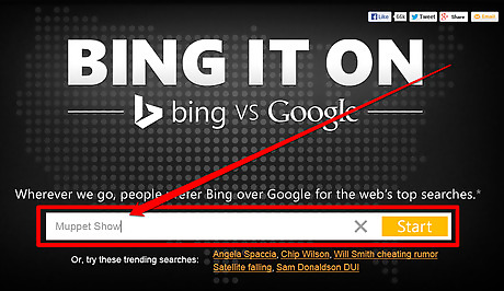 Locate and input your first search term into the huge search text box in the direct center of the page. If you don't know what to search for, check out some of the popular search terms that are listed below the box. These links are what are some trending topics at this moment.Take the Bing It On Challenge Step 3 Substep 1.png
