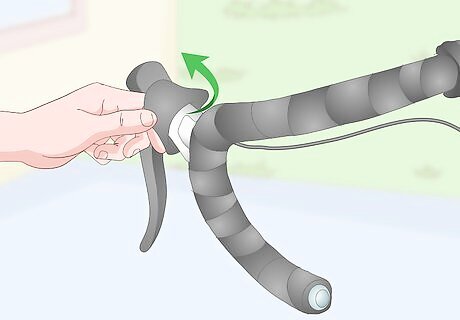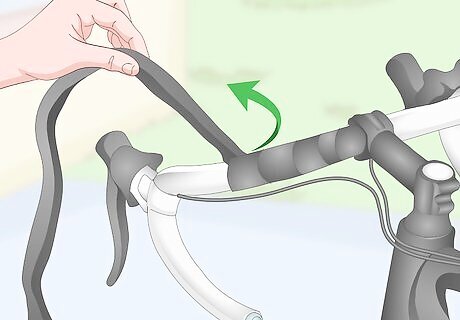 Flip back the brake lever hoods. Most handlebars that are taped have flexible covers that fold over the connection between the brake handles and the handlebar. Flip the end of these hoods back over themselves, towards the brake handle. The goal is to get the end off the bars so that the wrapping can go under them. The brake hood lies on top of the brake lever and provides a comfortable grip.