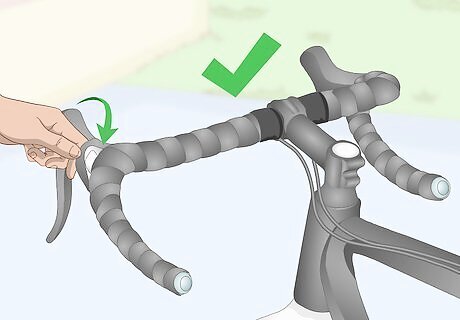 Adjust the brake levers. Brake levers are located at the front of the curved part of the handlebars. They are depressed to bring the bicycle to a stop. To adjust them, unscrew the screw on the brake lever to be able to move it. Once unscrewed, move it up, down, or to the side of the handlebar if needed. Screw it back tightly into place once adjusted. The bottom of each handlebar on one side should be level with the bottom of each corresponding lever. Each brake lever should also be level with the side of its corresponding bar. Hold a ruler along the bottom to check if it’s level or not. Having the brake levers in the correct position will help ensure that the handlebar tape can be wrapped around them and will not be disturbed by repositioning the levers. Set a level across the hoods to make sure they’re in an even position.