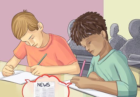 Ask students to write their own news article about a local event. Tell students to find an event in their school or local community. Their assignment will be to write a short news piece on the event. Encourage students to use journalistic practices, like interviews or surveys. A school fair, election, sports game, or rally are great events for students to write on. Another option is to connect students with community figures and ask them to write a profile on them. For example, have students write about the principal, government workers, business leaders, or volunteers in your local community. For a multimedia approach, ask students to make their own news show. Form students into groups, with each group presenting 2-3 stories in their show.