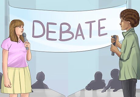 Hold a debate about a current issue. Break up the class into 2 different sides of an issue. Assign each group a side in the debate. Give them time to research their opinion before holding a debate between each side. Set a time limit for each group to present their argument and counterargument. Timing each group as they speak is a great way to ensure that each side can be heard. Encourage students to be civil in their arguments and to back up their points with research. To encourage students to think critically about both sides of the issue, consider switching sides for each student half-way through the debate so that they now have to argue for the opposite position.