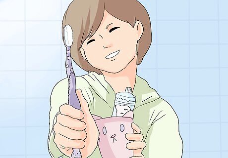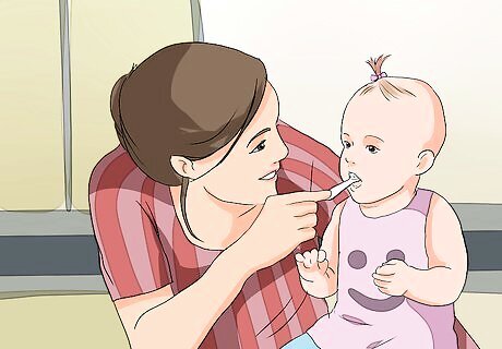 Start early. Start cleaning your child’s gums even before he or she has any teeth. It will help keep his/her mouth and gums healthy and it sets a pattern of oral care for both of you. Use a damp, soft cloth or gauze pad, or buy an infant gum brush/massager, and gently wipe the gumline. Begin brushing as soon as a tooth appears. Use a soft brush; many experts advise using a rice grain-sized amount of fluoride toothpaste, but you can at least start by just wetting the brush. You can also get a special flavored toothpaste that is meant for babies.