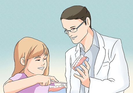 Visit the dentist. It is recommended that a child visit the dentist by age 1 or within 6 months of the first tooth appearance, whichever comes first. Bring your child to 1 of your appointments, or that of an older sibling, cousin, or friend. Ask the dentist to let your child observe what happens at a dental checkup. Your child may be more receptive to hearing why healthy teeth are so important from the person in the white coat with all the fancy tooth gadgets. Find books or videos about visiting the dentist. Help them be more familiar and less frightened.
