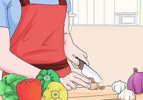 Develop your knife skills so you can prep ingredients like a pro. When you pick up a knife, put your index finger on the outside of the blade and grip your other fingers around the top of the handle. When dicing something up, use the tip-fulcrum method: leave the tip of your knife in place on the cutting board and move your hand up and down as you dice and chop. Use an all-purpose kitchen knife for chopping, slicing, and pretty much anything else you might need to do in the kitchen. Use a paring knife to peel fruits and vegetables. Use a bread knife to slice breads. A bread knife is serrated, which means it’ll cut through soft breads without crushing them. You can look up tutorials online to see how best to dice up certain ingredients.