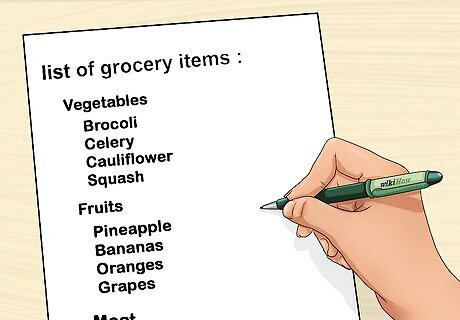 Visit the grocery store to gather your ingredients. If your parent normally shops for the groceries, ask if you can tag along—it’s really important to learn where things are in the grocery store and how to find deals. For fresh ingredients, stick to the perimeter of the grocery store. That’s where you’re going to find fruits, vegetables, dairy items, meats, and bulk food items, like nuts and grains.