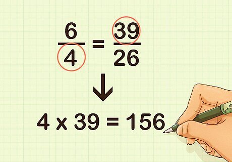 Compare the two products. If they are the same, then the ratios are in proportion. For example, since 156 = 156 {\displaystyle 156=156} 156=156, you know that 6 4 = 39 26 {\displaystyle {\frac {6}{4}}={\frac {39}{26}}} {\frac {6}{4}}={\frac {39}{26}}.