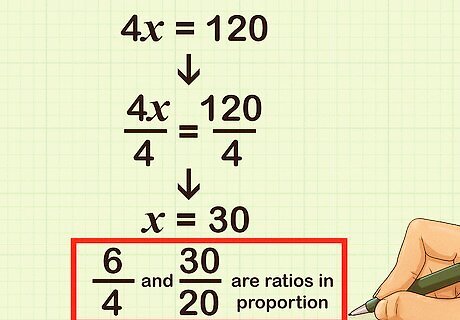 Solve for x {\displaystyle x} x. This will give you the missing number in your second ratio. The two ratios are now in proportion. For example: 4 x = 120 {\displaystyle 4x=120} 4x=120 4 x 4 = 120 4 {\displaystyle {\frac {4x}{4}}={\frac {120}{4}}} {\frac {4x}{4}}={\frac {120}{4}} x = 30 {\displaystyle x=30} x=30.So, if you need 6 cups of flour for 4 batches of cookies, you will need 30 cups of flour for 20 batches of cookies. Thus, 6 4 {\displaystyle {\frac {6}{4}}} {\frac {6}{4}} and 30 20 {\displaystyle {\frac {30}{20}}} {\frac {30}{20}} are ratios in proportion.