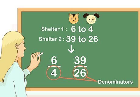Identify the denominator of each ratio. Ratios can be expressed using a colon ( 1 : 2 {\displaystyle 1:2} 1:2), the word “to” ( 1 to 2 {\displaystyle {\text{1 to 2}}} {\text{1 to 2}}), or a fraction bar ( 1 2 {\displaystyle {\frac {1}{2}}} {\frac {1}{2}}). Set up your ratios as fractions. The denominator is the number below the fraction bar. For example, if one shelter’s ratio of cats to dogs is 6 to 4, and another shelter’s ratio of cats to dogs is 39 to 26, you would rewrite the ratios as 6 4 {\displaystyle {\frac {6}{4}}} {\frac {6}{4}} and 39 26 {\displaystyle {\frac {39}{26}}} {\frac {39}{26}}. So, the denominators are 4 {\displaystyle 4} 4 and 26 {\displaystyle 26} 26.