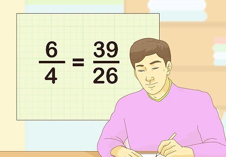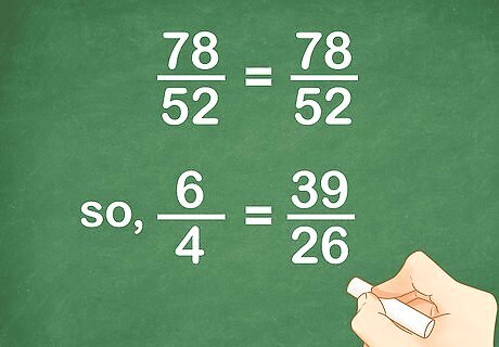 Write the equivalent fraction for the second ratio. Follow the same steps you did to find the equivalent fraction for the first ratio. For example, if the second ratio is 39 26 {\displaystyle {\frac {39}{26}}} {\frac {39}{26}}, you would divide the least common multiple (52) by 26: 52 ÷ 26 = 2 {\displaystyle 52\div 26=2} 52\div 26=2.So, you will multiply the numerator (39) by 2: 39 × 2 = 78 {\displaystyle 39\times 2=78} 39\times 2=78.So, your new fraction becomes 78 52 {\displaystyle {\frac {78}{52}}} {\frac {78}{52}}.