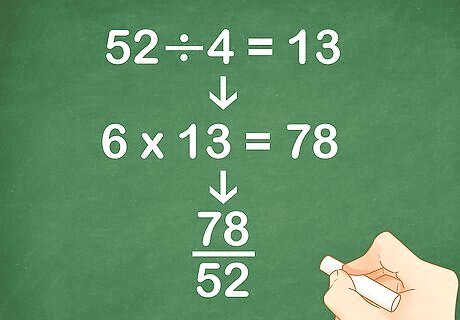 Write the equivalent fraction for the first ratio. To find the equivalent fraction, divide the least common multiple by the denominator. Multiply the numerator by this quotient. This will give you the new numerator of your equivalent fraction. For example, if the first ratio is 6 4 {\displaystyle {\frac {6}{4}}} {\frac {6}{4}}, you would divide the least common multiple (52) by 4: 52 ÷ 4 = 13 {\displaystyle 52\div 4=13} 52\div 4=13.So, you will multiply the numerator (6) by 13: 6 × 13 = 78 {\displaystyle 6\times 13=78} 6\times 13=78.So, your new fraction becomes 78 52 {\displaystyle {\frac {78}{52}}} {\frac {78}{52}}.