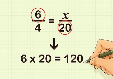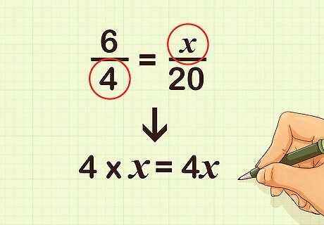 Multiply the numerator of the first fraction and the denominator of the second fraction. Place this product to the right of the equation. For example, 6 × 20 = 120 {\displaystyle 6\times 20=120} 6\times 20=120: 6 4 = x 20 120 {\displaystyle {\frac {\cancel {6}}{4}}={\frac {x}{\cancel {20}}}120} {\frac {{\cancel {6}}}{4}}={\frac {x}{{\cancel {20}}}}120