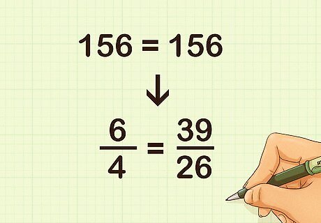 Set up the ratios as equivalent fractions. Ratios are sometimes expressed using a colon ( 1 : 2 {\displaystyle 1:2} 1:2) or the word “to” ( 1 to 2 {\displaystyle {\text{1 to 2}}} {\text{1 to 2}}). If your ratios are set up this way, turn them into fractions. For example, if you are comparing the ratios 6 to 4 and 39 to 26, set them up as follows: 6 4 = 39 26 {\displaystyle {\frac {6}{4}}={\frac {39}{26}}} {\frac {6}{4}}={\frac {39}{26}}.