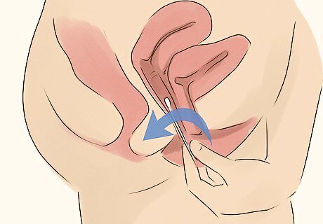 Use your free hand to open your vaginal folds. Position yourself in a comfortable sitting or squatting position, or stand with one leg up on the toilet. Spread your labia apart using your non-dominant hand to make for easier insertion of the test.