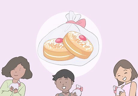 Pass out low-cost favors to guests at the end of the party. The cost of bridal shower favors can add up quickly, especially if your guest list is on the long side. Keep the cost down by making or buying something low-cost to send home with your guests. Some examples of low-cost favors include: Small potted plants Individually wrapped cookies or cupcakes A hand-written thank-you note Homemade soaps or candles Homemade bath bombs Tip: Remember to match the party favors to the bridal shower’s theme if possible. For example, if you threw the bride a fancy tea-party themed shower, then you might make cookies decorated to look like tea cups or give everyone a small cellophane bag with 1 bag of each of the bride’s favorite teas in it.