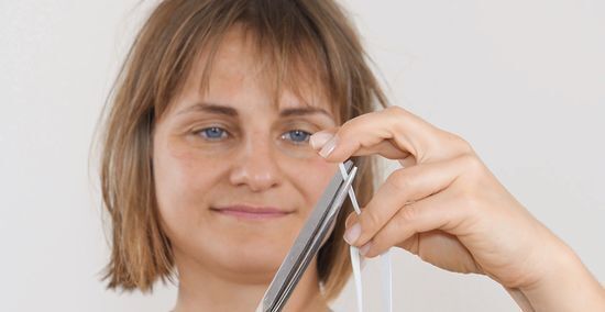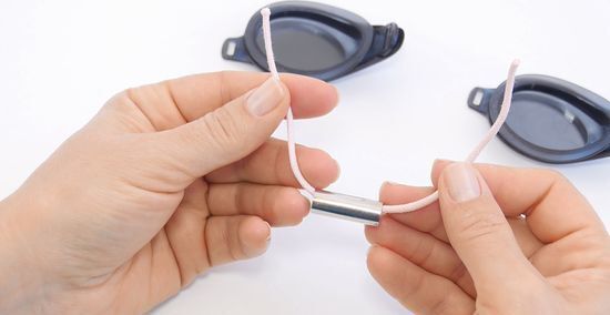Slide the plastic or rubber nose piece onto the middle of the string. Hold the short piece of string in 1 hand and pick up the small plastic or rubber nose piece in your other hand. Poke 1 end of the string through the nose piece and pull it through until the nose piece is centered on the string. The nose piece is usually either cylindrical or rectangular and sometimes has the brand name of the goggles printed on it.