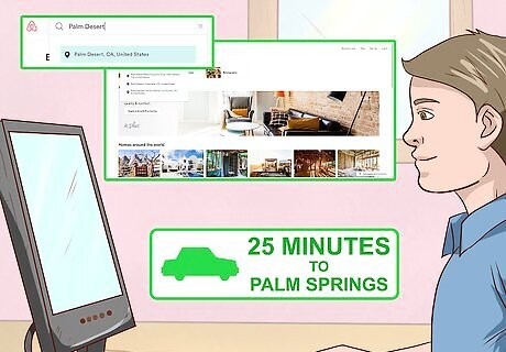 Look for lodging right outside of major cities or highly populated areas. You can escape the extra cost and still have easy access to tourist-populated cities by looking in towns that are 10-20 minutes outside of the city. This way, you can spend the day in the city and easily travel back to your lodging at night. For example, instead of looking for an Airbnb or a hotel in the Palm Springs area, check the Palm Desert area. They’re only 25 minutes apart, but Palm Desert generally has much cheaper prices. If you’re traveling to Disneyland, book an off-property hotel. While the Disney resorts are beautiful, you can save loads of money by staying at a Disney Good Neighbor Hotel just across the street, or even a hotel located several miles away.