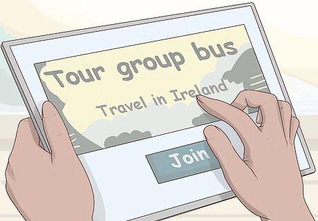 Join a large tour group bus to have a travel plan. If you want to make new friends and be given a guided tour of the country, sign up for a large tour group. Your trips, accommodation, and most meals will be planned, so you won’t have to worry about any logistics while you are there. You will, however, be in a large group of tourists that could affect your travel experience.Tip: Look up the itinerary of the tour group before you book it to make sure that most of the places are where you’d like to visit.