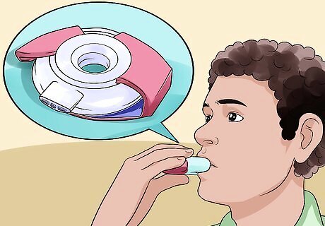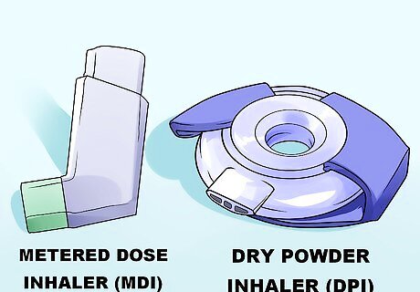 Get the inhaler prescribed by your physician. There are two different type of rescue medications that you may have been prescribed your doctor, a Metered Dose Inhaler (MDI) or a Dry Powder Inhaler (DPI). MDIs the are most common inhalers. They deliver asthma medication through a small aerosol canister equipped with a chemical propellant that pushes the medication into the lungs. An MDI can be used alone or with a breathing chamber ("spacer") that separates your mouth from the inhaler, and which can allow you to breathe normally to receive the medication and help the medication get into the lungs more efficiently. A DPI inhaler means of delivering dry powder asthma rescue medication without propellant. Brand names of DPI medications include Flovent, Serevent, or Advair. A DPI requires you to breathe in quickly and deeply, which makes them difficult to use during an asthma attack. This makes them less popular than the standard MDIs. Whichever you have been prescribed, make sure you are always carrying it with you.