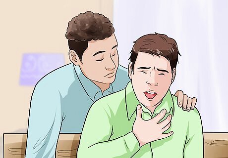 Help the individual find a comfortable position. Most people with asthma will be more comfortable sitting and not standing or lying down. Keep the person upright to assist with lung expansion and ease of breathing. Let the person lean slightly forward onto you or a chair for support. Some asthmatics may sit in a "tripod" position by leaning forward with their hands on their knees to relieve pressure on their diaphragm. Asthma is exacerbated by anxiety but it is not triggered by anxiety. This means that during an attack the individual will respond more rapidly when he is calm. Anxiety releases cortisol in the body which constricts the bronchioles, the passages by which air passes through the nose and/or mouth to the air sacs of the lungs. It's important that you stay calm and reassuring as this can assist the person in maintaining calm.