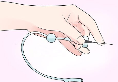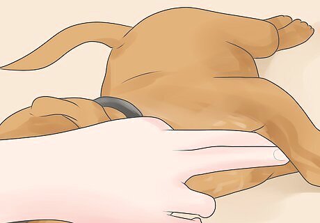 Have the fluid drained from your dog’s abdomen for short-term relief. If a lot of fluid has built up in your dog’s abdomen, your vet might recommend having the fluid drained. This will provide your dog with temporary relief because when the fluid is drained, his diaphragm will be able to expand more fully and pressure will be taken off of his vital organs. Unfortunately, the fluid will most likely return, though how long that will take depends on how sick your dog is. To drain the fluid, the vet will: Pass a sterile needle or special catheter, passed through your dog’s previously clipped and sterilized skin. Suction is applied via a closed collection system, such as a syringe with a three-way tap, until all the fluid has been removed. Most good natured dogs do not need to be sedated for this procedure, and will only need to be given some local anesthetic. Draining your dog’s abdomen repeatedly may make them uncomfortable and resistant to drainage procedures.