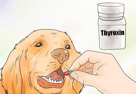 Give your dog thyroid hormone. Hypothyroidism is relatively simple to correct, as the golden retriever merely needs to be given extra thyroid hormone in tablet form. Most thyroid tablets are given twice a day, so that a steady level remains in the blood stream. The tablets contain thyroxine (levothyroxine), of which Soloxine is the brand name product. There are however generic varieties available, which have the advantage of being cheaper, whilst there is a slight question mark that they are not as effective as Soloxine because they are not so well absorbed by the body.