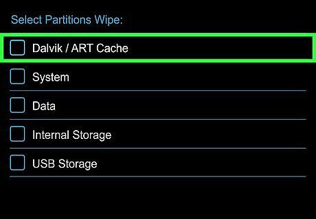 Wipe the Dalvik cache. Once your Android finishes installing the ROM, you can wipe the cache by doing the following: TWRP - Tap Wipe, tap Dalvik, and then swipe right the switch at the bottom of the screen. ClockworkMod - Select advanced, select wipe dalvik cache, and confirm your choice.