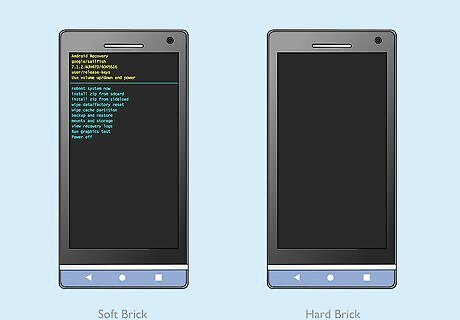 Determine the type of brick. There are two types of brick: a soft brick—which usually results in your Android booting directly into the recovery console or restarting endlessly—and a hard brick, which results in your Android being impossible to turn on or interact with. As a basic rule of thumb, if you can turn on or off your Android, you're dealing with a soft brick. Unfortunately, there is nothing you can do if your Android has been hard-bricked.