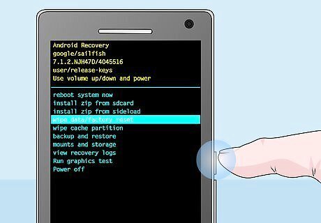 Select wipe data/factory reset. Use the Volume - button to scroll down to the this option, then press the Power button to open it.