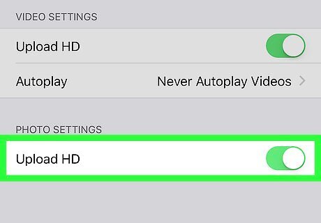 Slide the “Upload HD” switch On iPhone Switch On Icon. As long as this switch is on (green), the photos you upload to Facebook from this phone or tablet will appear in their full high-definition resolution.