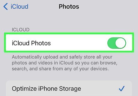Toggle the switch next to "iCloud Photos" to On iPhone Switch On Icon. This will automatically upload your entire Photos library (including video) when your device syncs to iCloud. You can choose between Optimize Storage or Download and Keep Originals. The former will prioritize iCloud over local storage to save space, the latter will keep the original copy on the phone. iCloud Photo Library uses iCloud storage space. You can store any number of photos as long as you have the available space. Your photo library can now be accessed from the Photos app on your iPhone, iPad, or Mac. You can also access your photo library from a web browser by going to the Photos section of www.icloud.com.