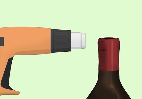 Seal the wine bottle. Use the heat gun on a low setting. Move the stream of air over the seal without lingering in any single area. Rotating the bottle as heat is applied will help insure this. Do not let the tip of the heat gun make contact with the seal. Continue until the seal appears snug. Avoid over-shrinking the seal, which could cause the seal to crack.