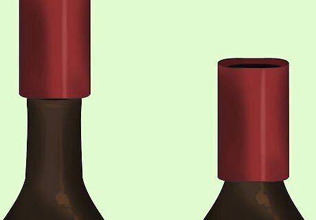 Place the wine bottle seal. Slide the seal over the neck of the corked wine bottle with the tear-away band on the end of the seal closest to the bottle opening. Slide the seal down far enough that it wraps around the flared edge of the bottle opening, but will not close over the cork.