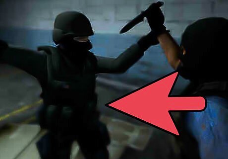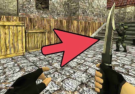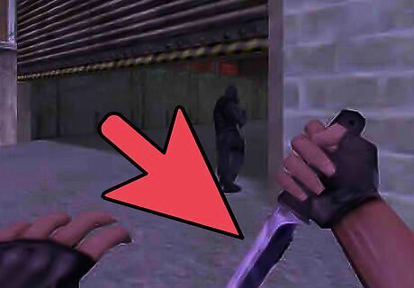 Creep. If you are in a knife fight, then ignore this step. It will do you no good. If you are not, then walk, rather than run. There is a walk button for a reason. The walk button is bound to Left SHIFT by default; you can also crouch to cancel out footstep noises by holding left CTRL by default. Footsteps are silent when you walk, but you will slow down. If he is running, run carefully behind, once you are close, walk. This should set you up perfectly. Once you get closer, execute a backstab. Use a Knife Efficiently in Counter Strike Step 3 Version 2.jpg